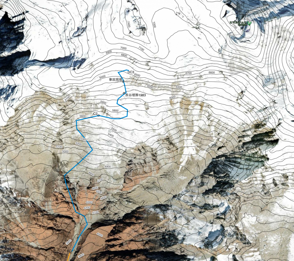 10月6日 キャン プ3建設のため、4名づつ2隊に分かれて前進中,9時15分6300m地点で先行の金沢,藤 田,森里,長谷隊が滑落。長谷・藤田2名が死 亡。金沢・森里2名が重傷。